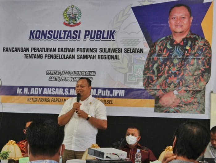 SELAYAR,MEDIATA.ID-– Ketua Fraksi NasDem DPRD Prov Sulsel, Ir. H. Ady Ansar, S Hut, M MPub, IPM, pimpin Konsultasi Publik Rancangan Peraturan Daerah (Ranperda) Provinsi Sulsel tentang Pengelolaan Sampah Regional.