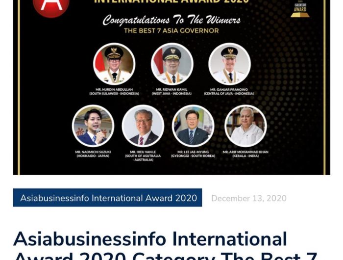 Penghargaan Internasional tersebut diberikan oleh Asia Business Info pada kategori The Best 7 Asia Governors 2020. Selain Nurdin, dua Gubernur terbaik di Indonesia juga ikut bersanding yakni Gubernur Jawa Barat, Ridwan Kamil dan Gubenur Jawa Tengah Ganjar Pranowo.