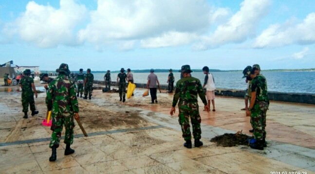 SELAYAR,MEDIATA.ID. Personil Kodim 1415 Kepulauan Selayar melaksanakan kerja bakti, membersihkan sampah disekitar Taman Pusaka, Kelurahan Benteng, Kecamatan Benteng, hari ini Jum’at (12/3/2021).