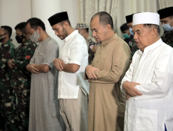 JAKARTA, MEDIATA.ID — Ketua Dewan Masjid Indonesia (DMI) Jusuf Kalla didampingi Ibu Mufidah Kalla, putra-putri serta cucu dan bersama pengawalnya dari Paspampres dan Polri melaksanakan salat ghaib di kediaman pribadinya di Jalan Brawijaya No. 6, Jakarta Selatan, Ahad 25 April 2021.