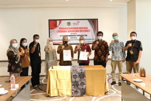 LUTIM,MEDIATA.ID- Kepala Dinas Komunikasi dan Informatika (Kominfo) Kabupaten Luwu Timur, Masdin, AP, M.Si bersama General Manager PT. Telkom Witel Sulselbar, Sri Widodo, melakukan penandatanganan bersama tentang Layanan Jaringan Internet untuk OPD dan Area Publik di Kabupaten Luwu Timur yang berlangsung di Somba Bone Meeting Room Novotel Makassar, Kamis (08/04/2021).
