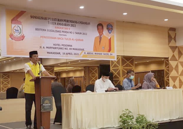 MAKASSAR, MEDIATA.ID — Anggota DPRD Kota Makassar, Abd Wahab Tahir menggelar sosialisasi Peraturan Daerah (Perda) nomor 1 tahun 2012 tentang Pendidikan Baca Tulis Alquran. Kegiatan ini dilaksanakan di Hotel Pessona, Minggu (18/4/2021).