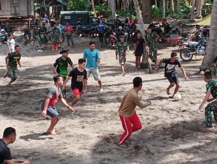Terpantau media, saat sore hari ketika personil satgas selesai bekerja untuk pembangunan fisik, mereka bermain bola di tengah- tengah perkampungan.