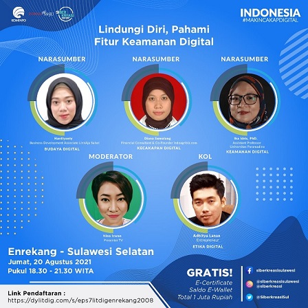 Program kali ini dipandu oleh Nina Izwan sebagai moderator dan menghadirkan empat narasumber yang terdiri dari konsultan keuangan dan Co-Founder Indoagribiz.com, Diana Sumolang; pengusaha, Adhitya Lanae; Business Development Associate LinkAja Sulsel, Hardiyanty; serta Asisten Profesor Universitas Paramadina, Ika Idris. Rangkaian Program Literasi Digital “Indonesia Makin Cakap Digital” di Sulawesi menargetkan peserta sebanyak 57.550 orang.