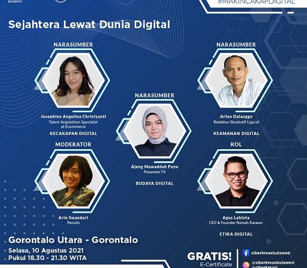 GORONTALO, MEDIATA.ID — Rangkaian Program Literasi Digital “Indonesia Makin Cakap Digital” di Sulawesi, yang diselenggarakan oleh Kementerian Komunikasi dan Informatika Republik Indonesia dan Siberkreasi bersama Dyandra Promosindo, dilaksanakan secara virtual pada 10 Agustus 2021 di Kabupaten Gorontalo Utara, Provinsi Gorontalo. Kolaborasi ketiga lembaga ini dikhususkan pada penyelenggaraan Program Literasi Digital di wilayah Sulawesi. Adapun tema saat ini adalah “Sejahtera Lewat Dunia Digital”.