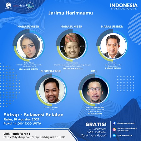 SIDRAP, MEDIATA.ID — Rangkaian Program Literasi Digital “Indonesia Makin Cakap Digital” di Sulawesi, yang diselenggarakan oleh Kementerian Komunikasi dan Informatika Republik Indonesia dan Siberkreasi bersama Dyandra Promosindo, dilaksanakan secara virtual pada 18 Agustus 2021 di Sidrap, Sulawesi Selatan. Kolaborasi ketiga lembaga ini dikhususkan pada penyelenggaraan Program Literasi Digital di wilayah Sulawesi. Tema yang diusung pada hari ini yaitu “Jarimu Harimaumu”.