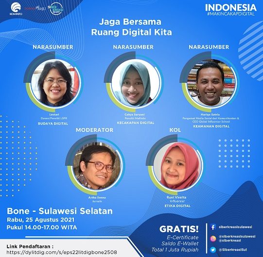 BONE, MEDIATA.ID — Rangkaian Program Literasi Digital “Indonesia Makin Cakap Digital” di Sulawesi, yang diselenggarakan oleh Kementerian Komunikasi dan Informatika Republik Indonesia dan Siberkreasi bersama Dyandra Promosindo, dilaksanakan secara virtual pada 25 Agustus 2021 di Bone, Sulawesi Selatan. Kolaborasi ketiga lembaga ini dikhususkan pada penyelenggaraan Program Literasi Digital di wilayah Sulawesi. Adapun tema saat ini adalah “Jaga Bersama Ruang Digital Kita”.