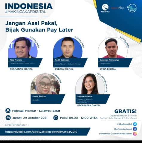 POLEWALI MANDAR, MEDIATA.ID – Rangkaian Program Literasi Digital “Indonesia Makin Cakap Digital” di Sulawesi, yang diselenggarakan oleh Kementerian Komunikasi dan Informatika Republik Indonesia dan Siberkreasi bersama Dyandra Promosindo, dilaksanakan secara virtual pada di Polewali Mandar, Sulawesi Barat. Kolaborasi ketiga lembaga ini dikhususkan pada penyelenggaraan Program Literasi Digital di wilayah Sulawesi. Adapun tema kali ini adalah “Jangan Asal Pakai, Bijak Gunakan Pay Later”.
