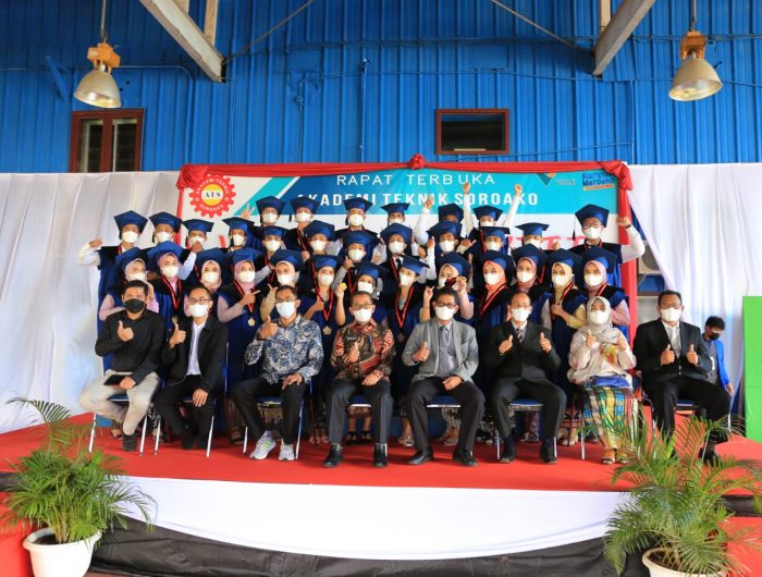 Sebanyak 47 Mahasiswa Akademi Teknik Sorowako (ATS) Program Studi Perawatan dan Perbaikan Mesin untuk gelar Diploma III Tahun Akademik 2020/2021 mengikuti prosesi Wisuda hari kedua yang dihadiri Sekda Luwu Timur, H. Bahri Suli, di Gedung ATS, Sabtu (13/11/2021).