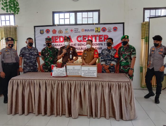 SELAYAR,MEDIATA.ID-Kejaksaan Negeri Kepulauan Selayar menyerahkan bantuan berupa paket sembako untuk yang terdampak bencana gempa laut Flores di Media Center Penanganan Darurat Bencana Gempa 7.4 SR, Jln Krg Bonto, Benteng.