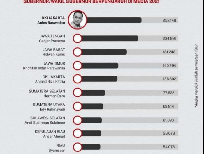 Adapun dalam research ini, posisi pertama ditempati oleh Gubernur DKI Jakarta Anies Baswedan dengan muncul dalam 127.677 berita. Posisi kedua Gubernur Jawa Tengah Ganjar Pranowo dengan 85.158 berita; Ketiga Gubernur Jawa Barat Ridwan Kamil (RK) dengan 73.567 berita; Keempat, Gubernur Jawa Timur Khofifah Indar Parawansa dengan 51.830 berita; Kelima, Wakil Gubernur DKI Jakarta, Ahmad Riza Patria 39.648 berita; keenam hingga sepuluh masing-masing ditempati oleh Gubernur Sumatera Utara Edy Rahmayadi (28.273 berita), Gubernur Sumatera Selatan Herman Deru (24.866 berita), Gubernur Riau Syamsuar (23.442 berita), Gubernur Sulawesi Selatan Andi Sudirman Sulaiman (21.863 berita), serta Gubernur Kepulauan Riau Ansar Ahmad (18.562 berita).