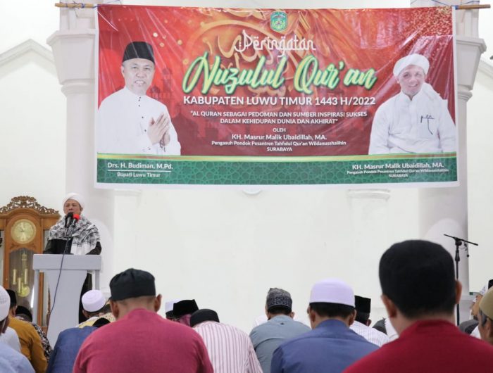 Lutim, mediata.Id -Malam ke-17 ramadhan, Pemerintah Kabupaten Luwu Timur menggelar Peringatan Nuzulul Qur’an tingkat Kabupaten 1443 H / 2022 M, di Masjid Agung Malili, Kelurahan Malili, dirangkaikan dengan Shalat Tarwih berjamaah, Senin (18/04/2022) malam.