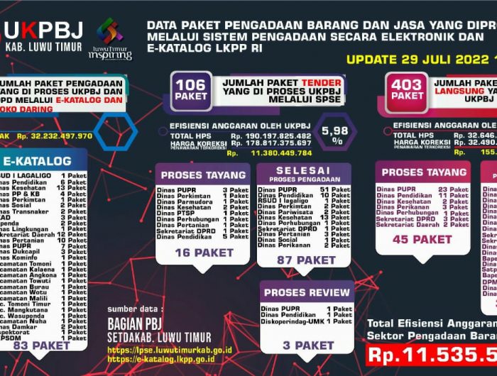 Luwu Timur, mediata.Id -Efisiensi anggaran belanja barang/jasa Pemerintah Kab. Luwu Timur melalui pengadaan secara elektronik Tahun Anggaran 2022 mencapai Rp. 11.535.570.539. Angka ini diperoleh dari selisih HPS dan hasil 87 Paket tender dan 358 Paket Non Tender per tanggal 29 Juli 2022 yang telah selesai diproses oleh teman-teman Pokja dan Pejabat Pengadaan melalui Sistem Pengadaan Secara Elektronik (SPSE).