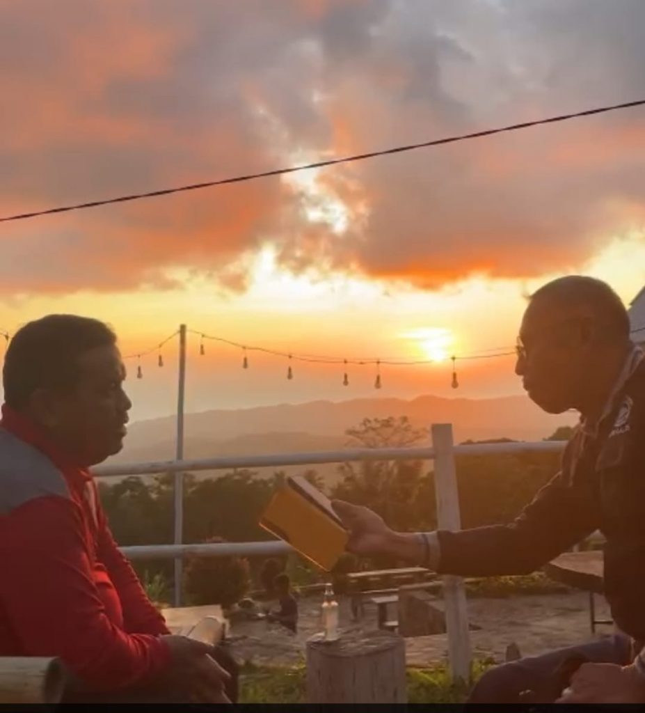 Dari sini ( Puncak Tanadoang red) kita bisa menyaksikan mata hari terbenam. Ini kalau di Jawa bisa menghasilkan banyak uang tutur Direktur Iyan dengan nada sedikit bercanda namun serius sambil menikmati segelas kopi dan Ubi goreng.