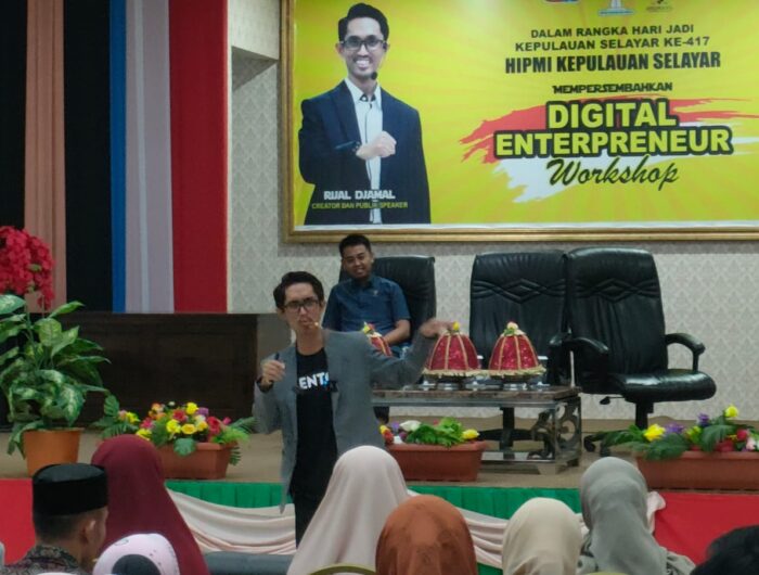 SELAYAR, MEDIATA.ID- Dukung Pemerintah daerah meningkatkan Sumber Daya Manusia (SDM), HIPMI Kepulauan Selayar mempersembahkan Workshop Digital Enterpreneur.Kegaitan yang fokus membahas terkait masalah-masalah seputar wirausaha, baik tantangan maupun prospek kedepan Menghadirkan seorang Creator dan Publik Speaker terkenal, Rijal Jamal sebagai narasumber.Kegiatan HIPMI ini dibuka secara resmi oleh Asisten Ekbang Setda, Ir. Arfang Arief di Ruang Pola Kantor Bupati, Kamis (8/12)Mewakili Bupati, Arfang Arif menyampaikan apresiasi dan dukungan kepada HIMPI Selayar atas pelaksanaan Workshop Digital Enterpreneur yang dinilainya sebagai bahagian dari upaya peningkatan SDM masyarakat.“Sangat disesalkan dan kita sangat rugi jika sumber daya alam daerah kita sangat melimpah, jika SDM kita untuk mengelolanya sangat terbatas” cetusnyaAsisten Ekbang bergumang, peningkatan SDM tak cukup hanya dengan pendidikan formal disekolah, tetapi harus dibarengi dengan workshop, Bimtek serta juga harus dengan semangat dan motivasi.Manfaatkan kesempatan ini untuk menambah ilmu, kedepan dengan kemajuan teknologi, tantangan semakin berat dan semakin komplex, pesan Arfang Arif kepada peserta workshop yang didominasi kaum millenial dan pelaku UMKM.Sebelemnya Ketua HIPMI Selayar, Muh. Aqsa Ramadhan mengatakan acara ini dimaksudkan untuk memberikan wawasan dan semangat baru kepada para generasi muda dan pengusaha pemula dalam menghadapi persaingan di dunia degital.“anak-anak millenial harus punya ide-ide kreatif, inovatif untuk melakukan usaha, saat ini adalah era nya digital sehingga kita harus mampu bersaing agar tidak ketinggalan,” ujarnyaHarapanya lanjut Aqsa Ramadan dengan Workshop ini Pelaku UMKM tumbuh dan berkembang yang pada akhirnya pembangunan ekonomi daerah juga meningkat.Sementara itu Rijal Jamal dalam materinya mengatakan “musuh dari mengambil tindakan adalah terlalu banyak berpikir, Always Take Action” (Ical)