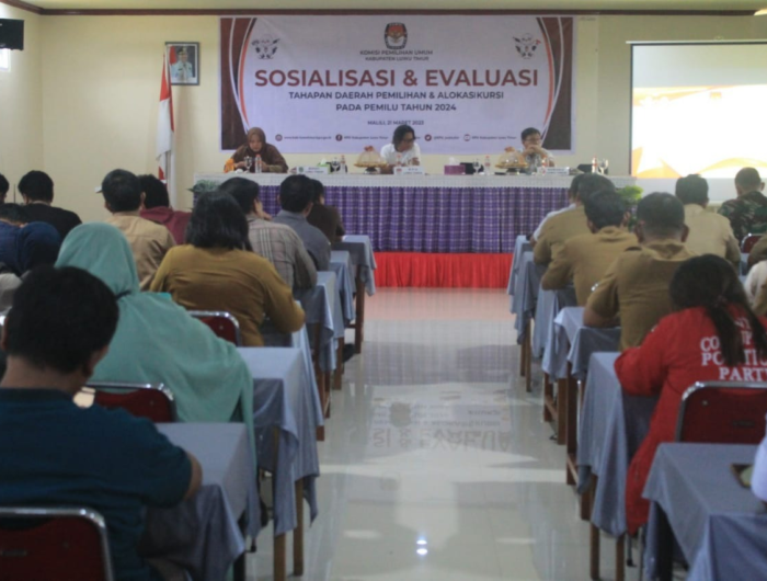 Luwu Timur, mediata.id -Asisten Pemerintahan dan Kesra Kabupaten Luwu Timur, Aini Endis Anrika mewakili Bupati Lutim, menghadiri Sosialisasi dan Evaluasi Tahapan Penyusunan Daerah Pemilihan (Dapil) dan Alokasi Kursi pada Pemilihan Umum (Pemilu) serentak Tahun 2024, yang diselenggarakan oleh KPU Lutim, di Ballroom Hotel I Lagaligo Lantai Tiga, Selasa (21/03/2023) kemarin.