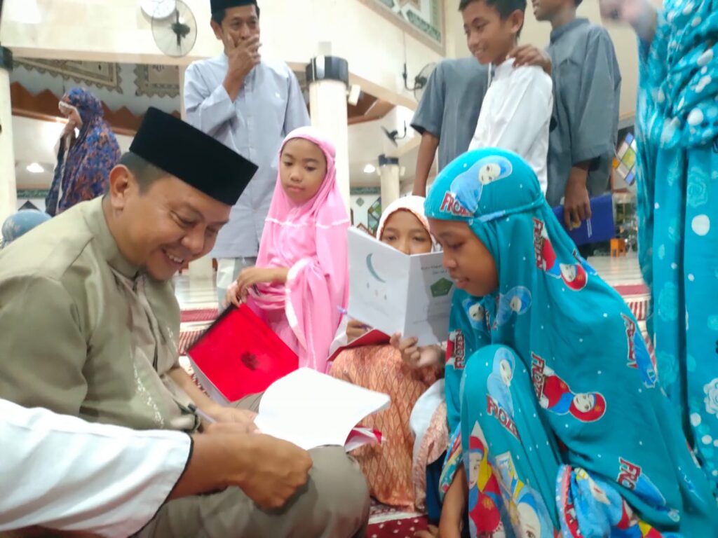 Usai menunaikan ibadah shalat tarwih, dengan senang hati Bupati Basli Ali menyempatkan diri menandatangani ratusan buku amaliah ramadhan yang disedorkan para siswa sekolah dasar. (Humas-IC)