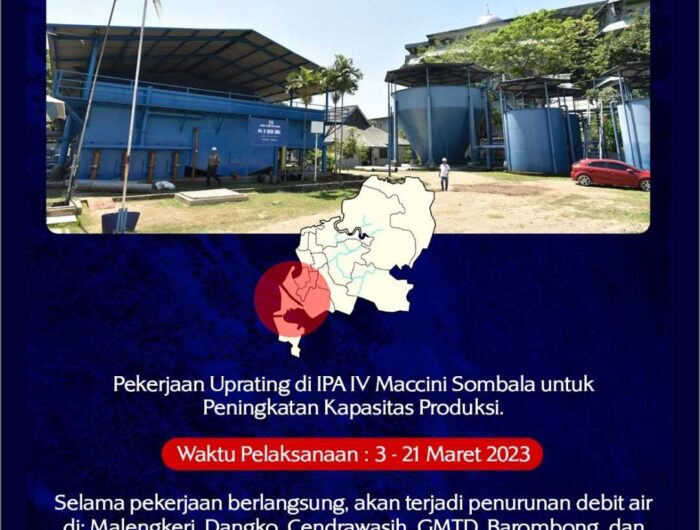 Direktur Utama (Dirut) Perumda Air Minum Kota Makassar, Beni Iskandar, SH dalam keterangannya mengatakan, pekerjaan uprating akan dilaksanakan mulai tanggal 3-21 Maret 2023.