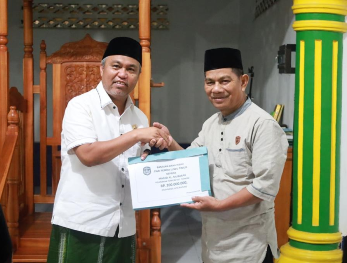 Pada kesempatan ini, Bupati Budiman menyerahkan bantuan dana hibah kepada pengurus masjid Al-Mubarak, sebesar Rp. 200 juta serta memberikan bantuan untuk 10 orang anak yatim dari Baznas Lutim.