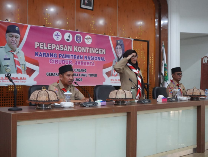 Luwu Timur, mediata.id -Ketua Kwartir Cabang (Kwarcab) Gerakan Pramuka Kabupaten Luwu Timur, Kak Hj. Sufriaty Budiman secara resmi melepas kontingen Pramuka Kab. Luwu Timur yang akan ikut dalam kegiatan Karang Pamitran Nasional (KPN) Tahun 2023 di Bumi Perkemahan Cibubur, Jakarta, yang dilaksanakan di Aula Rujab Bupati, Kamis (22/06/2023).