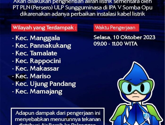 Pengumuman resmi Perumda Air Minum (PDAM) Makassar menyebutkan akan terjadi penurunan tekanan distribusi air PDAM di sejumlah titik pada Selasa (10/10/2023) hari ini