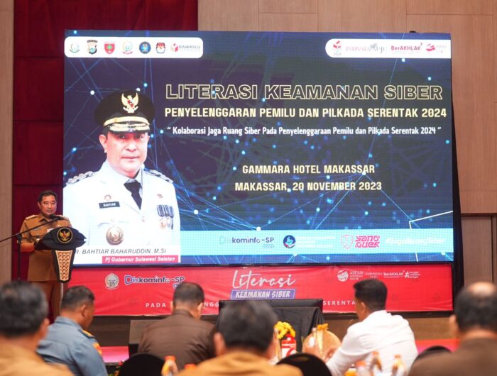 MAKASSAR, MEDIATA.ID – Penjabat Gubernur Sulsel, Bahtiar Baharuddin, membuka Literasi Keamanan Siber pada Penyelenggaraan Pemilu, yang dilaksanakan di Hotel Gammara, Kota Makassar, Senin, 20 November 2023. Ia berharap kepada stakeholder terkait untuk memperkuat proteksi penyebaran informasi bohong atau hoaks.