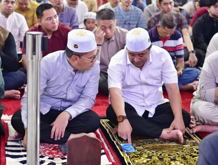 MAKASSAR, MEDIATA.ID — Wali Kota Makassar Moh Ramdhan Pomanto bersama Pj Gubernur Sulsel Bahtiar Baharuddin melaksanakan buka puasa bersama di Lego-lego, Kawasan CPI dan melanjutkan Salat Tarawih di Masjid 99 Kubah, Minggu, (17/03/2024).