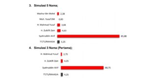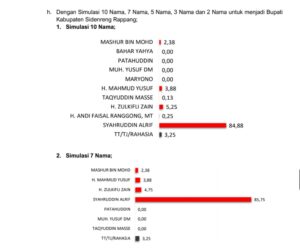 Survei ini memunculkan beberapa simulasi nama Kandidat. Mulai dari simulai 10 nama kandiat, 7 nama hingga head to head memunculkan nama anggota DPRD Sulsel dari Partai NasDem Syaharuddin memiliki survei paling tinggi yang diinginkan oleh masyarakat Sidrap menenjadi Bupati.