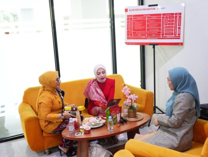MEDIATA.ID – Ketua TP PKK Kota Makassar Melinda Aksa bersama Wakil Wali Kota Makassar Aliyah Mustika Ilham menerima kunjungan Ketua Bhayangkari Cabang Kota Besar Makassar Emma Arya Perdana, di Inkubator UMKM Kota Makassar, Lantai I Gedung MGC, Kamis (24/4/2025).