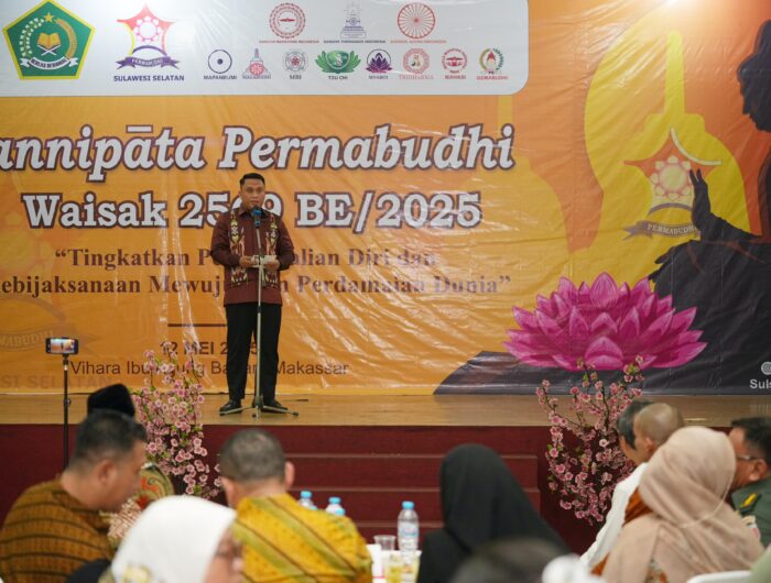 MEDIATA.ID – Kepala Dinas Komunikasi, Informatika, Statistik, dan Persandian (Kominfo SP) Provinsi Sulawesi Selatan (Sulsel), Andi Winarno Eka Putra, mewakili Gubernur Sulsel, Andi Sudirman Sulaiman, dalam perayaan Sannipata Permabudhi Waisak 2569 BE/2025 M di Vihara Ibu Agung Bahari, Jalan Sulawesi No. 41, Makassar, Senin, 12 Mei 2025.