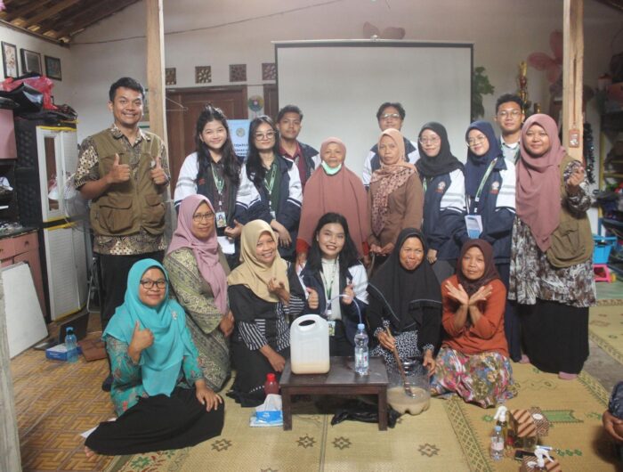 Mahasiswa KKN-T Undip Kelompok 3 bersama anggota KWT OASIS menunjukkan produk Mikroorganisme Lokal (MOL) dari nasi sisa yang berhasil dibuat dalam kegiatan pemberdayaan masyarakat di Dusun Onggopatran, Bantul.