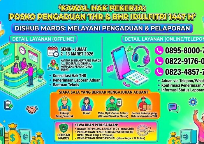 MEDIATA.ID — Memastikan kesejahteraan pekerja menjelang Lebaran, Pemerintah Kabupaten (Pemkab) Maros melalui Dinas Ketenagakerjaan dan Transmigrasi resmi membuka Posko Pengaduan Tunjangan Hari Raya (THR) dan Bonus Hari Raya (BHR) untuk Idulfitri 1447 Hijriah.